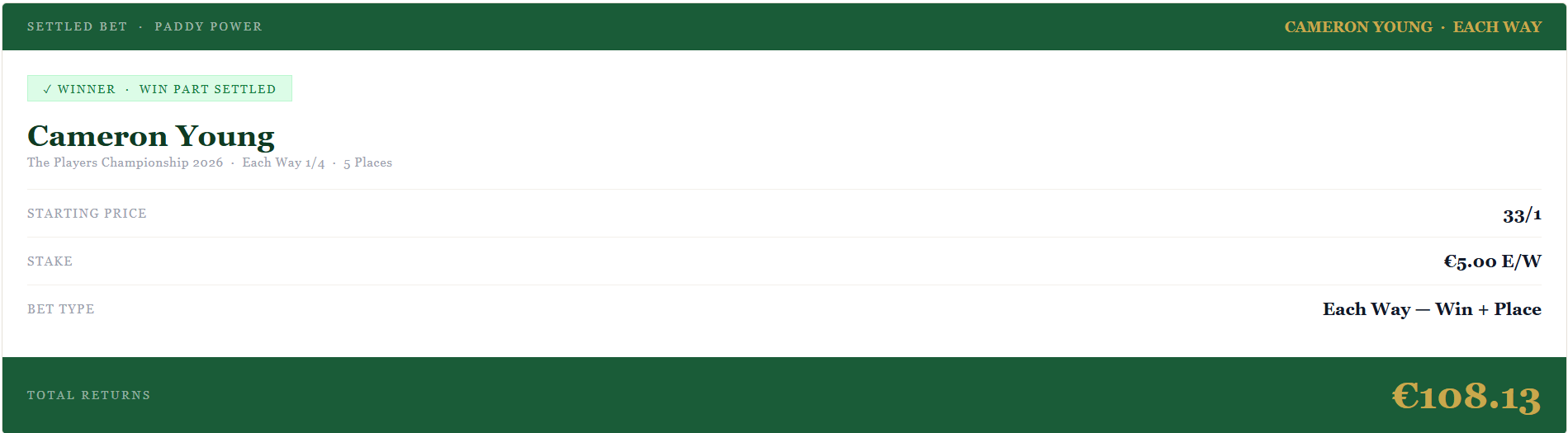 Cameron Young. 33/1. Each Way. Paid.